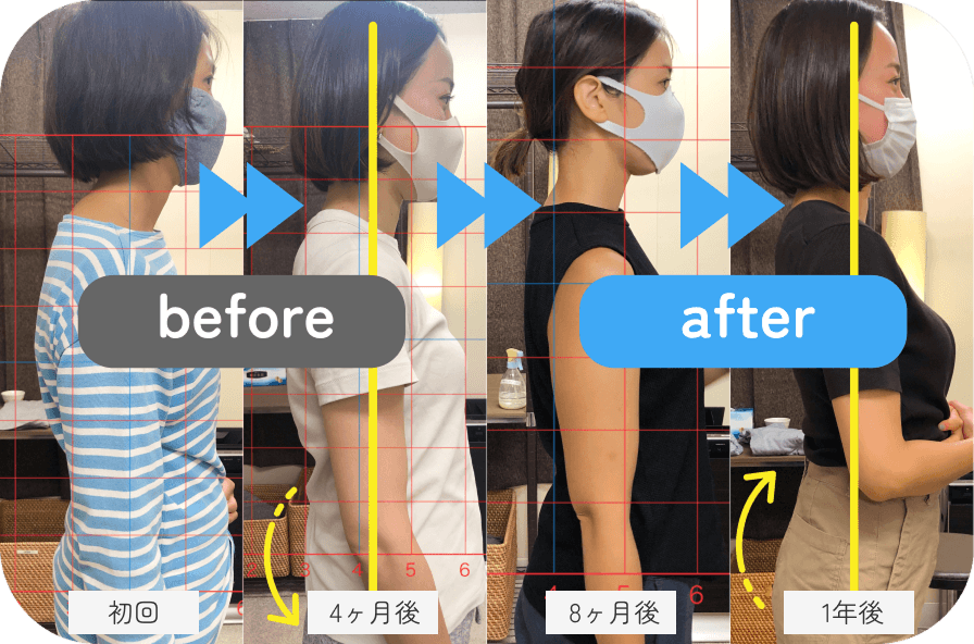 骨盤と背骨のズレを正しい位置へ整えることで、姿勢が改善し、スタイルも引き締まり、身体が軽くなり、表情も明るくなりました。
